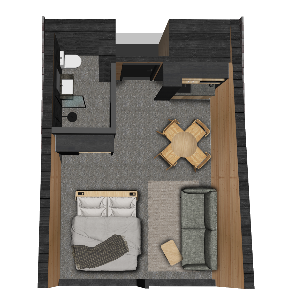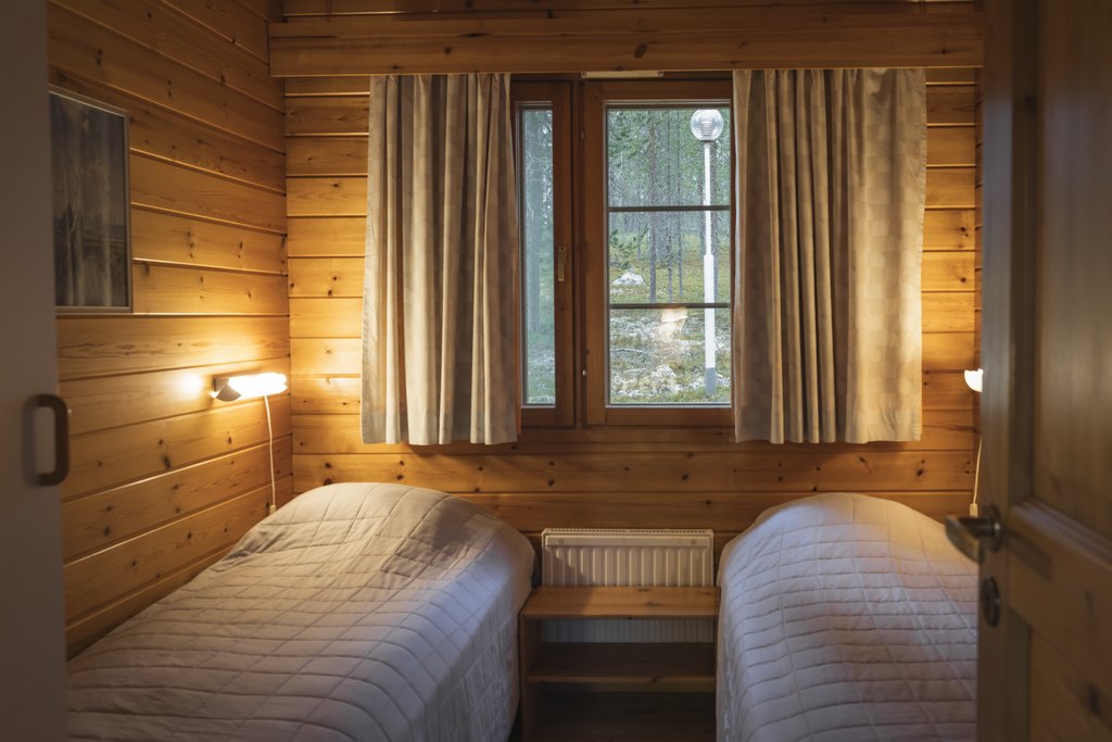 Huoneessa on parisänky tai kaksi erillistä vuodetta sekä vuodesohva yhdelle aikuiselle tai kahdelle lapselle. Oma kylpyhuone suihkulla ja wc:llä lisää mukavuutta. Tilat on suunniteltu toimiviksi ja rauhallisiksi, jotta lepo aktiivisen päivän jälkeen on helppoa.