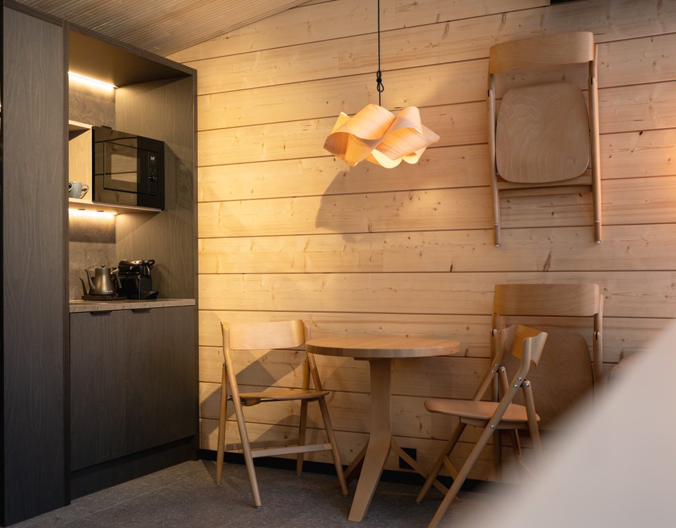 Mökin tiloihin kuuluu oleskelutila, perusvarusteltu keittiö, sauna suihkulla, erillinen wc sekä vaatteiden kuivauskaappi, joka on käytännöllinen erityisesti talvikaudella.