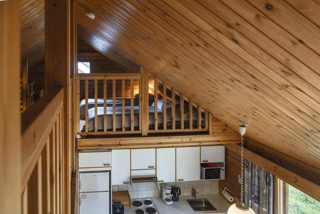 Mökissä on kaksi makuuhuonetta alakerrassa, molemmissa kaksi vuodetta, sekä parvi, jossa on kolme lisävuodetta. Parvelle kuljetaan jyrkkiä, tikasmaisia portaita pitkin, ja parvella on vinokatto. Retkipäivän jälkeen on helppo rentoutua takkatulen äärellä tai oman saunan lämmössä.